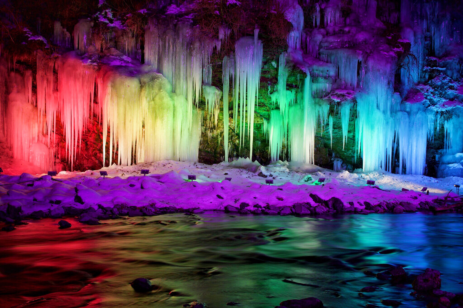 在冰柱的現場設有觀景步道,可以在步道上透過各個角度欣賞大自然的鬼斧神工,在冰柱規模最大的時期,還會在夜晚點上燈光,燈光照著晶瑩的冰柱,營造出像是童話般的特殊氛圍,是一場屬於大自然的特別盛宴。