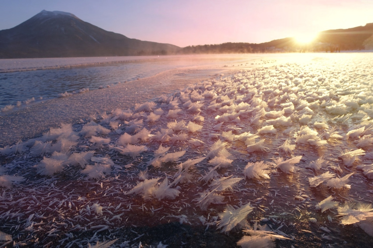 阿寒湖位於北海道東部的釧路市,是阿寒摩周國家公園內部的其中一座火口湖,以生長著日本指定特別天然紀念物「毬藻」而聞名。每當到了冬天,清澈的湖面上總會出現別名「霜之花」的自然現象,與東岸雄偉的阿寒岳相互輝映,共同編織成美麗的大自然絕景。