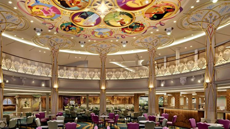 Town Square靈感源於《魔發奇緣》《灰姑娘》《冰雪奇緣》《白雪公主》《公主與青蛙》等電影中的奇幻世界。 該區域的核心是宛若夢幻溫室的Royal Court,其天花板飾有諸多公主和女英雄的彩色玻璃壁畫,宏偉華麗。作為遊輪內的主要室內娛樂中心,Town Square設有經典的Walt Disney Theatre全天上演精彩絕倫的百老匯風格音樂劇。