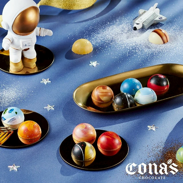 Cona's 這款禮盒把浩瀚銀河都裝進來了!每一顆半圓形巧克力皆由師傅手繪藝術外殼,內餡融合花、果、茶香。除了專屬星座,更有獨創的「自由座」奶酒拿鐵口味。送上一份對方專屬的星球守護星,不僅浪漫滿分,視覺效果更是無可取代。