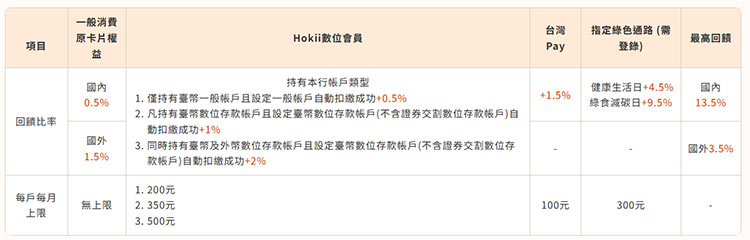 【Hokii數位會員 大好刷】一般消費除了享卡片權益及綠色通路、交通加碼外,設定一般/數位存款帳戶(不含證券交割數位存款帳戶)自動扣繳且扣繳成功(不含他行帳戶),並依持有帳戶類型(如下表),再享最高加碼2%回饋。