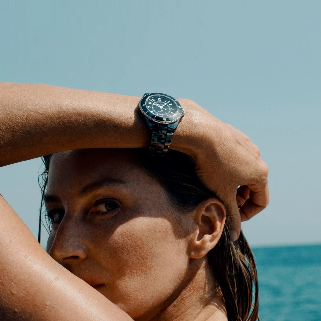 A:「J12」的設計靈感最初源於「水」與「極限運動」,特別是帆船運動的精神。在25週年的形象廣告中,品牌進一步深化了「水」的象徵語彙,既平靜平和又蘊藏無限力量,這份廣度與平衡正是「J12」傳達的核心美學價值。