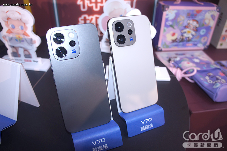 V70首發12GB+256GB、12GB+512GB版本,外型設計星曜黑、豔陽金、暮雲灰等顏色,建議售價2萬1,990元、2萬3,990元。V70 FE則有8GB+256GB、12GB+256GB版本,顏色有花紫、霧銀、夜藍等,建議售價1萬7,990元、1萬9,990元。雙機同步在3月13日發售,且與POP MART IP「ZSIGA」聯名,消費者於官方體驗店購機可獲得聯名禮盒,在官方商城購買能拿到聯名保護殼。