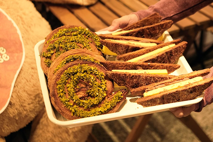 此次快閃共帶來四大產品系列,其中經典可頌一次推出多款風味,包括:杜拜巧克力、杏仁奶油、瑪格麗特與美式臘腸,從濃郁甜點到帶鹹香氣的版本都有,讓可頌不只是一款單一風味的麵包,而是能延伸出不同風格的日常選擇。另一個亮點是法式焦糖奶油酥系列,這次提供經典原味與開心果兩款口味,其中最受矚目的「開心果法式焦糖奶油酥」,外層覆上一層薄脆焦糖,入口先感受到清脆糖衣,接著是層層酥鬆的麵體,最後帶出濃郁滑順的開心果奶油內餡。從酥、鬆到綿滑的口感轉換相當鮮明,也讓整體風味在甜度與堅果香氣之間取得恰到好處的平衡。