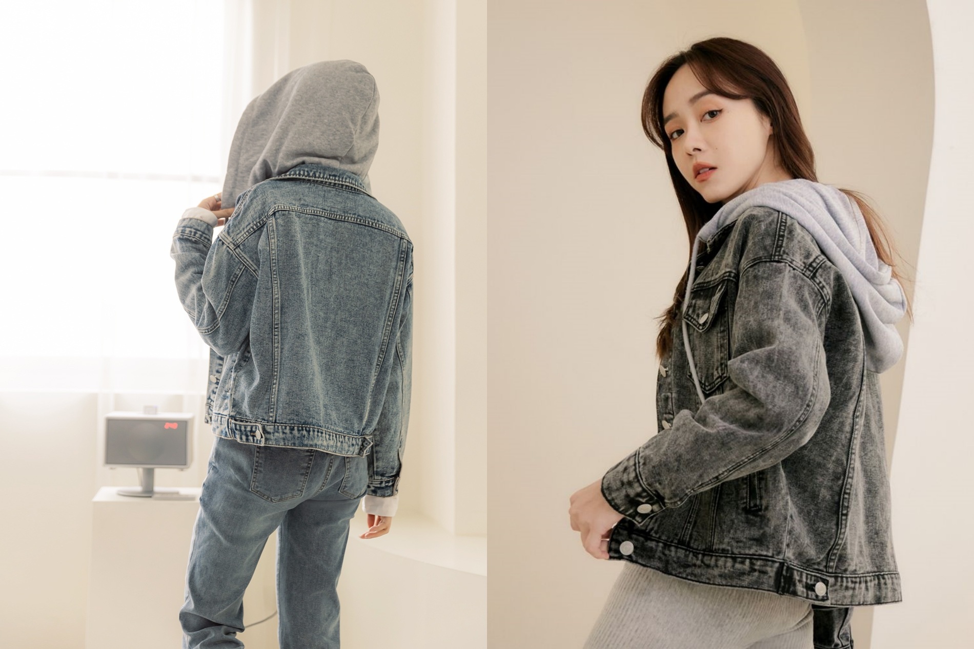 這款外套打破了傳統牛仔外套的單一印象,巧妙地在帽子部分拼接了異材質布料,讓經典單品瞬間充滿設計師品牌的高級質感。拼接處的色彩對比與線條切割,不僅修飾了身形,也讓穿搭更具視覺重點。水洗出的淡藍色調極致清爽,搭配棉質連身裙能完美平衡丹寧的硬挺感,是春季外出防風又兼顧造型的首選外搭。