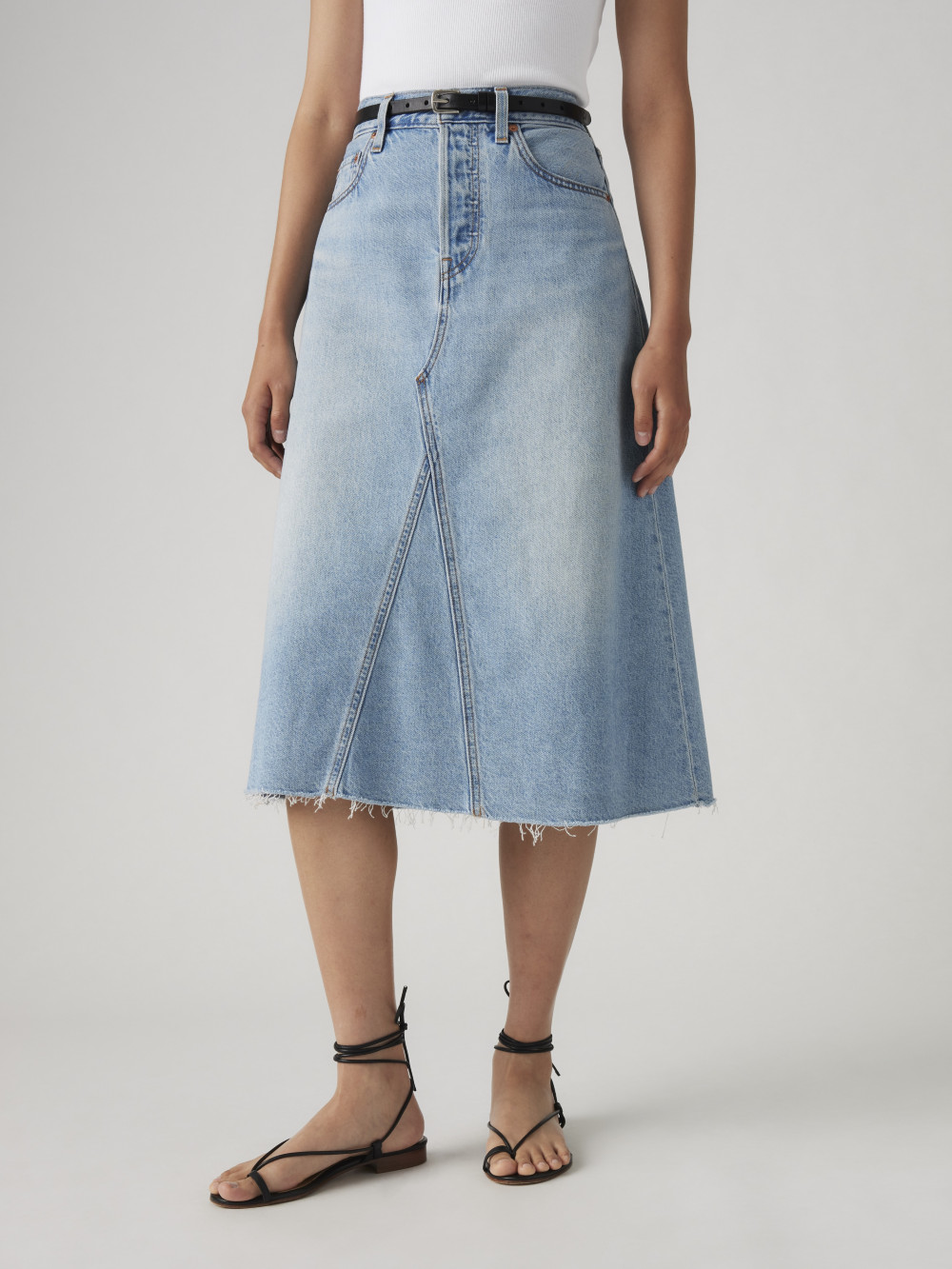 長裙是展現溫柔力量的最佳單品,這款牛仔長裙透過精細的水洗磨白工藝,呈現出一種充滿故事感的懷舊色澤。下擺採用微 A 字或直筒開衩剪裁,打破了丹寧材質可能帶來的僵硬感,隱約露出的腿部線條增加了整體的輕盈度。這類單品非常適合搭配亞麻襯衫,營造出一種森林系的清爽感;或是配上簡單的 T-shirt,展現出知性與休閒兼具的都市女性魅力。