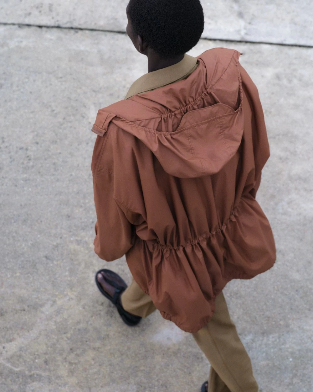A:這款外套長度落在臀線與大腿之間,加上腰部抽繩設計,可以依身形自由調整腰線,能修飾腰腹比例。對小個子或梨形身材的人來說,將抽繩稍微收緊能拉出腰線,讓整體比例看起來更俐落、不顯臃腫。
