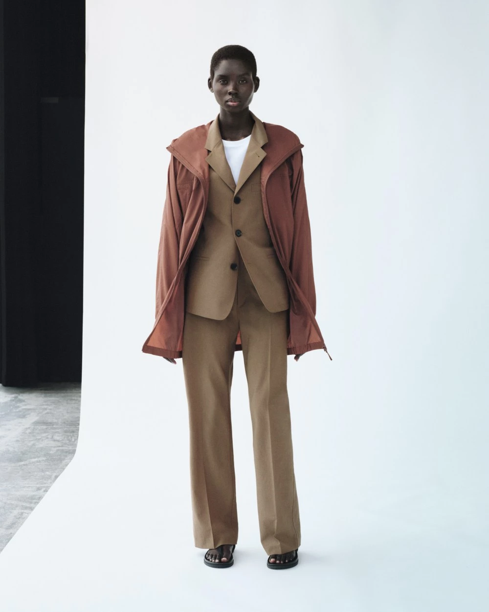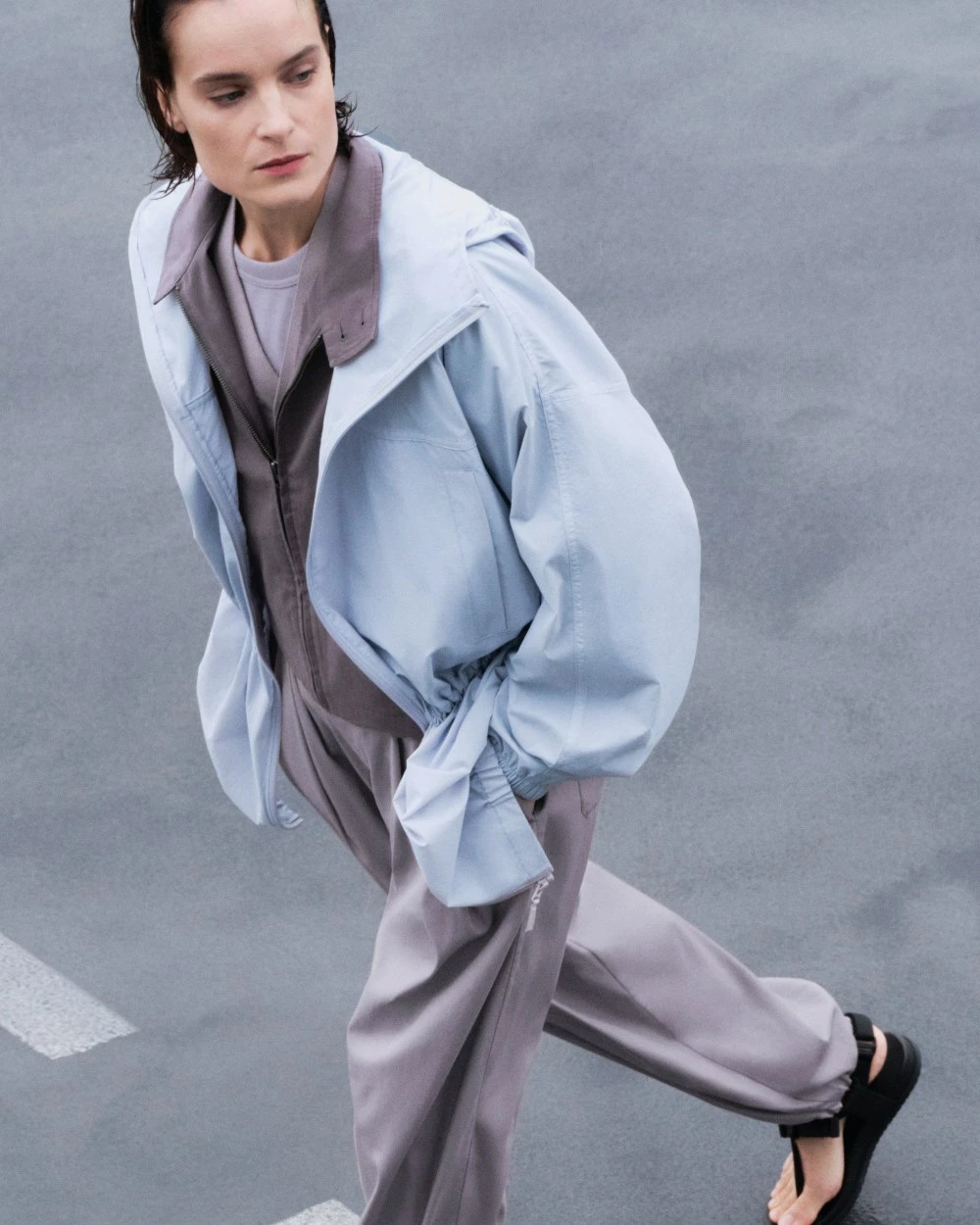 而回到穿搭造型上,我們認為腰部的抽繩是最大的焦點!這件外套的長度約落在臀線與大腿之間,而抽繩設計的位置則在正常腰線處,因此在搭配上,可以透過抽繩呈現腰線線條,同時也能形塑出收腰的漂亮版型,讓整體比例更為好看。