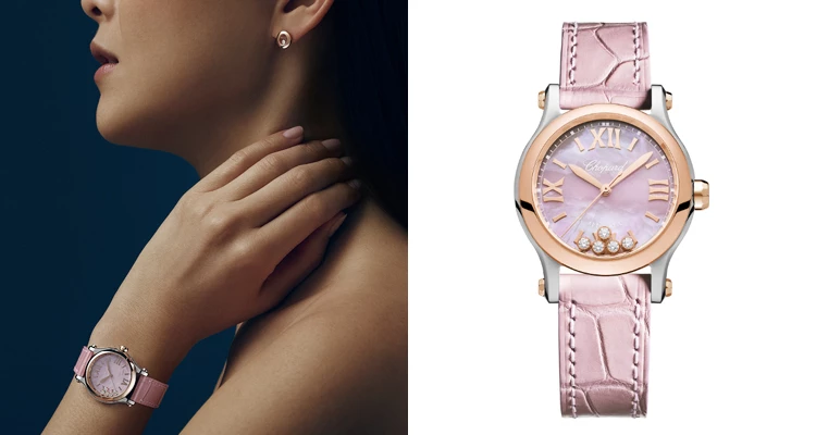 Chopard經典的「Happy Sport」腕錶系列,將「自由靈動」的精神,完美融入粉紅色彩中,最迷人之處在於,錶盤上那幾顆隨著手腕擺動而輕快起舞的滑動鑽石,在溫潤的粉紅色珍珠母貝襯托下,散發出活潑且極具生命力的光芒。再搭配同色系的皮革錶帶,完美展現了Sport Chic的精髓。(商品價格約:NTD 365,000)