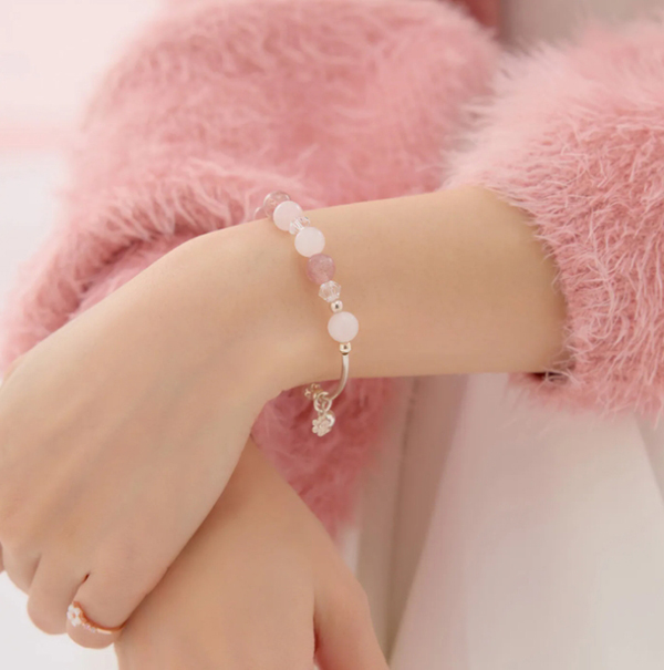 粉水晶手鍊結合純銀元素,散發出浪漫少女感!戴在手腕上時,微光閃爍卻不張揚。搭配短袖上衣、牛仔外套等休閒風都很適合,讓手部動作成為拍照焦點吧!粉色水晶呈現出溫柔、富有春天氣息的感覺。在漫天櫻花下,這種不經意的巧思,就是讓出遊穿搭質感升級的小秘密。