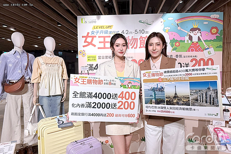 京站女王節啟動「LEVEL UP!女子升級進行式」計畫,自4月2日至5月10日打出全館消費滿4,000元送200元、化妝品/內衣/香氛滿2,000元贈200元的福利。Q卡友於首5日(4/2~4/6)購物最高享600元優惠;線下刷中華郵政卡、星展信用卡滿4,000元回饋200元,再加上化妝品/內衣/香氛當日買滿2,000元贈200元、滿4,000元送400元(累積贈送),總回饋率升上15%。
