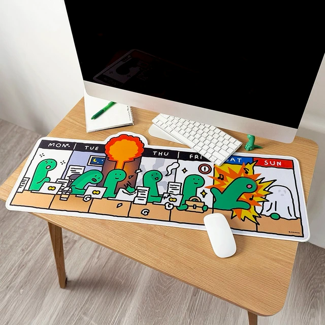 這款滑鼠墊真的很懂上班族!綠色的小腕龍 Brachio (布拉基歐) 把一週的精神狀態真實呈現,從週一放空到週五靈魂出走,每一格都像在照鏡子。超長型設計不只是好看而已,滑鼠移動空間更自由,鍵盤也能一起放上去,桌面瞬間乾淨俐落。當工作很累的時候,低頭看到它,會有一種「好吧大家都一樣」的微妙安慰。