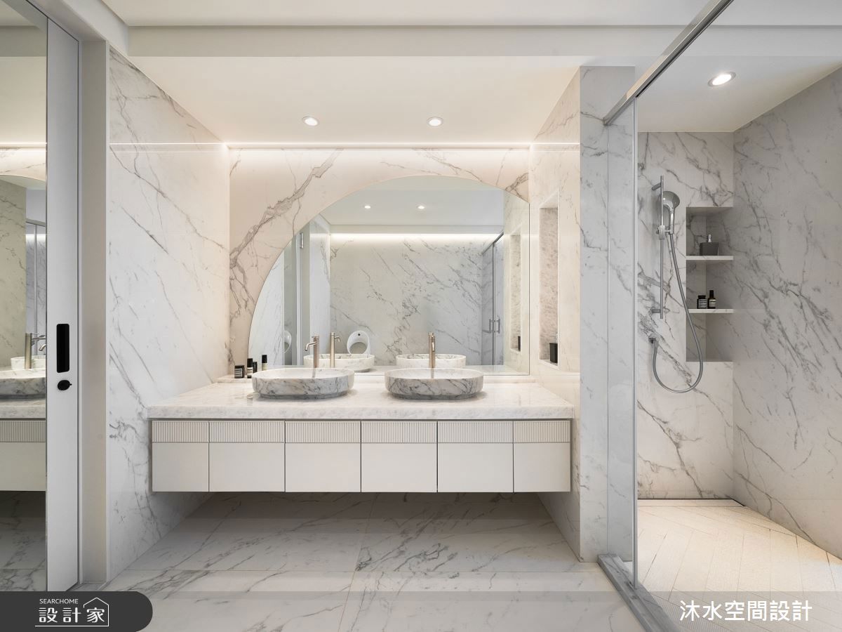 若空間條件允許,許多豪宅會進一步升級為五件式衛浴配置。五件式衛浴是在四件式的基礎上,增加雙洗手台或獨立化妝區。五件式衛浴最大的優勢在於提升生活效率與使用便利性。例如早晨準備出門時,夫妻可以同時使用雙洗手台,不會因為盥洗而互相等待。此外,雙洗手台也能提升空間的視覺對稱性,搭配大理石檯面與鏡面設計,往往能營造出五星級飯店浴室的高端氛圍,因此在豪宅主臥衛浴中特別受歡迎。