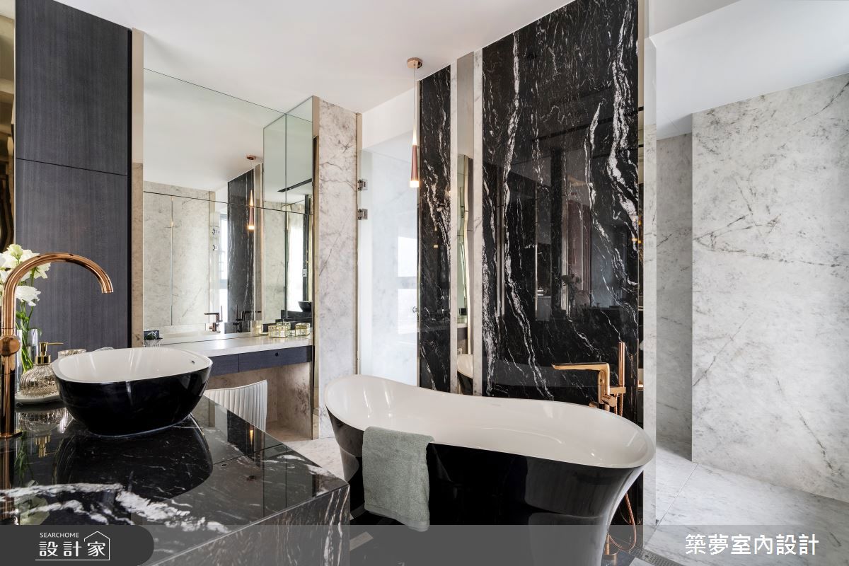 豪宅衛浴對於浴缸會特別重視,一般會選擇具備造型的獨立浴缸,也有些豪宅會規劃內嵌式浴缸,打造成飯店湯屋的泡澡體驗。泡澡區通常會設置於窗邊或空間中央,搭配落地龍頭與柔和燈光,形成放鬆的泡澡區域,也讓衛浴空間更具儀式感。