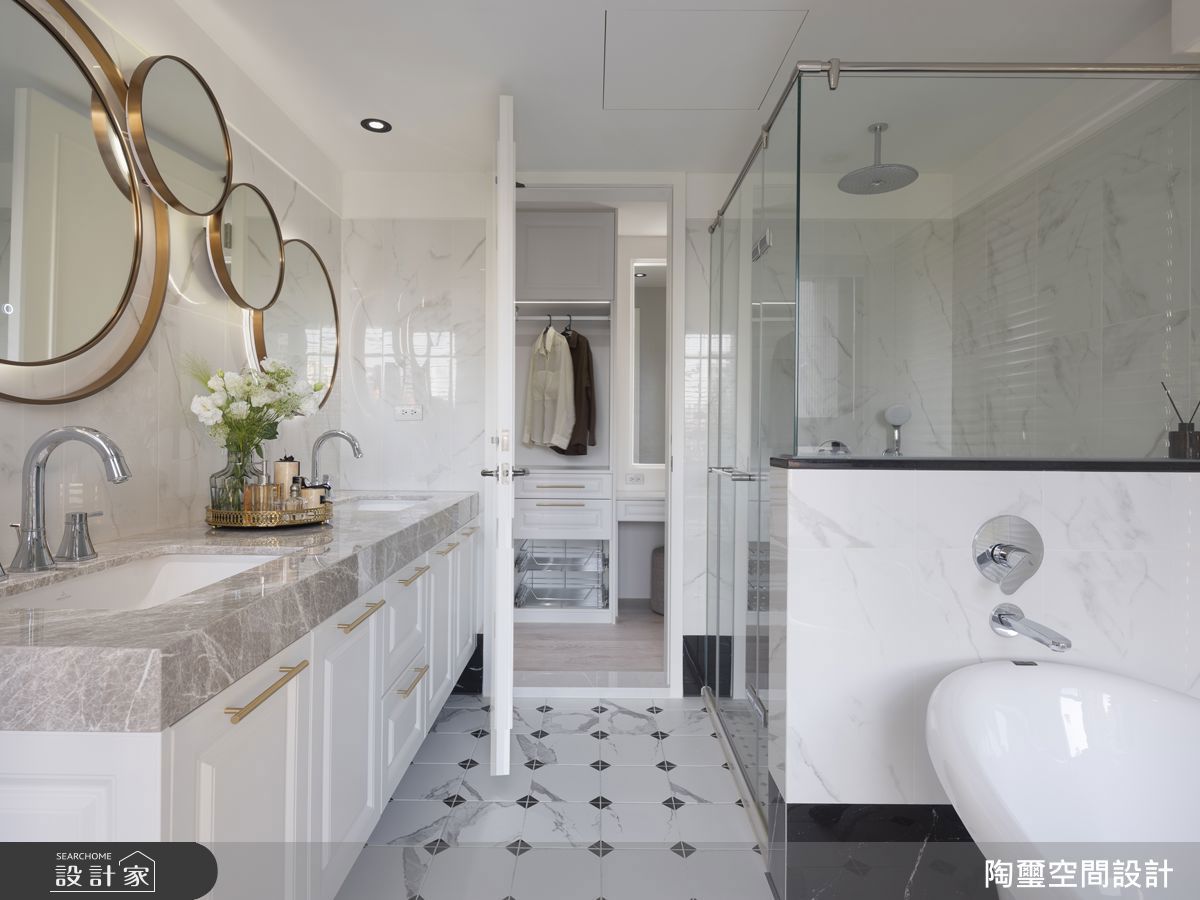 這是目前豪宅與現代住宅最常見的乾濕分離設計,透過透明強化玻璃隔間,可以在保持視覺通透的同時,有效阻隔淋浴水花,讓整體浴室看起來更寬敞明亮。