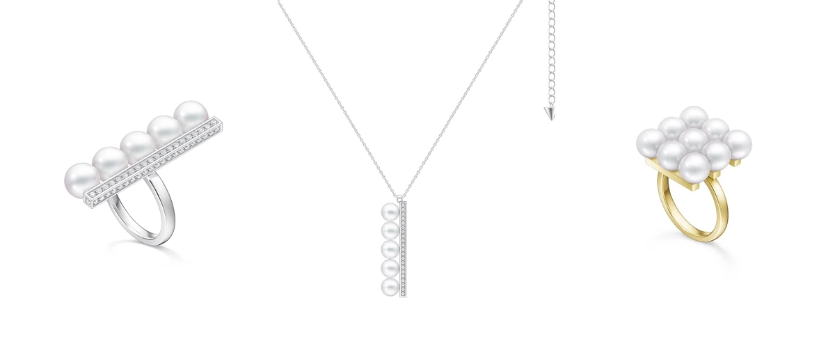 (左至右) balance plus系列18K白金鑲鑽&阿古屋珍珠戒指、balance plus系列18K白金鑲鑽&阿古屋珍珠項鍊、balance build系列18K黃金&阿古屋珍珠戒指,all by TASAKI。