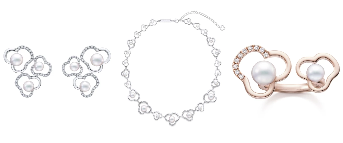 (左至右) chants 18K白金鑲鑽&阿古屋珍珠耳環、chants 18K白金鑲鑽&阿古屋珍珠項鍊、chants duo 18K櫻花金鑲鑽&阿古屋珍珠戒指,all by TASAKI。