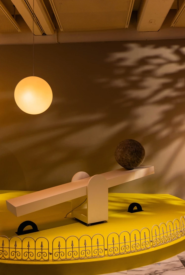 陳姿尹《Light up and down》,2023,LED 、燈罩、蹺蹺板、水泥球體、程式控制,尺寸依空間而定。圖像由藝術家與臺北市立美術館提供。