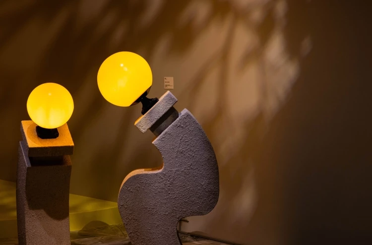 石孟鑫《門燈柱》,2025,石頭漆、木板、燈泡,50 x 50 x80、70 x 40 x 120、50 x 40 x 200、130 x 140 x 40公分。圖像由藝術家與臺北市立美術館提供。