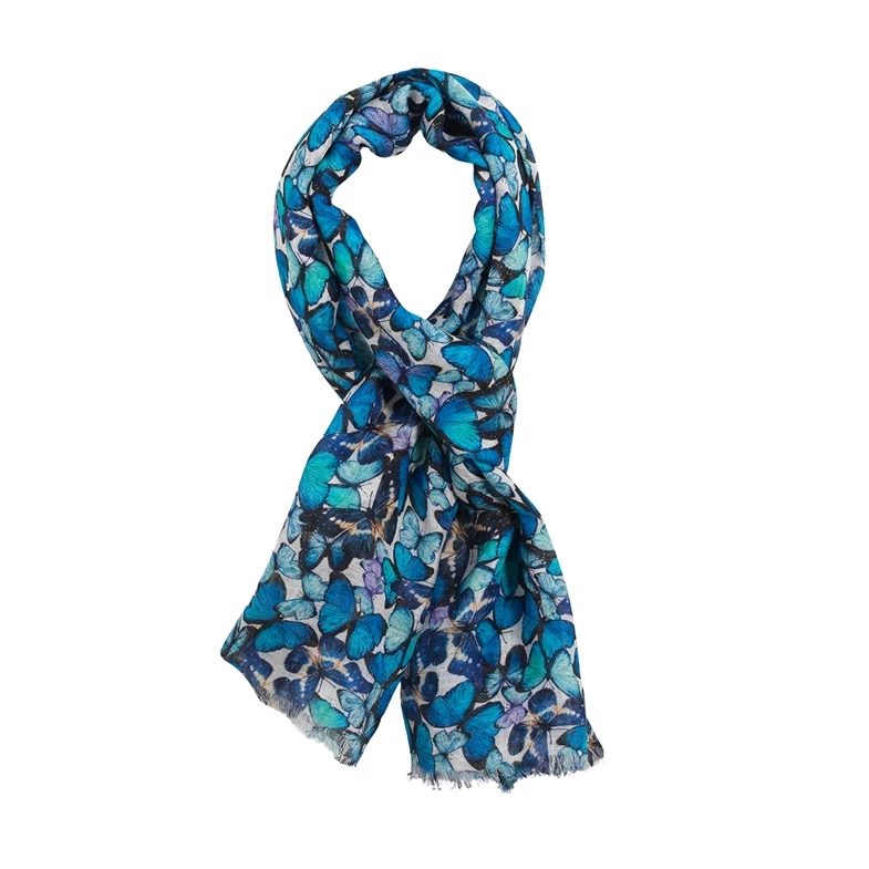 以輕盈亞麻材質為基底,揉合藍閃蝶印花與細膩色彩層次,隨著步伐自然飄動,為整體造型注入一抹靈動氣息,無論披掛或繫於頸間,都能輕鬆點亮春夏風格。(商品售價:NTD 2,980)