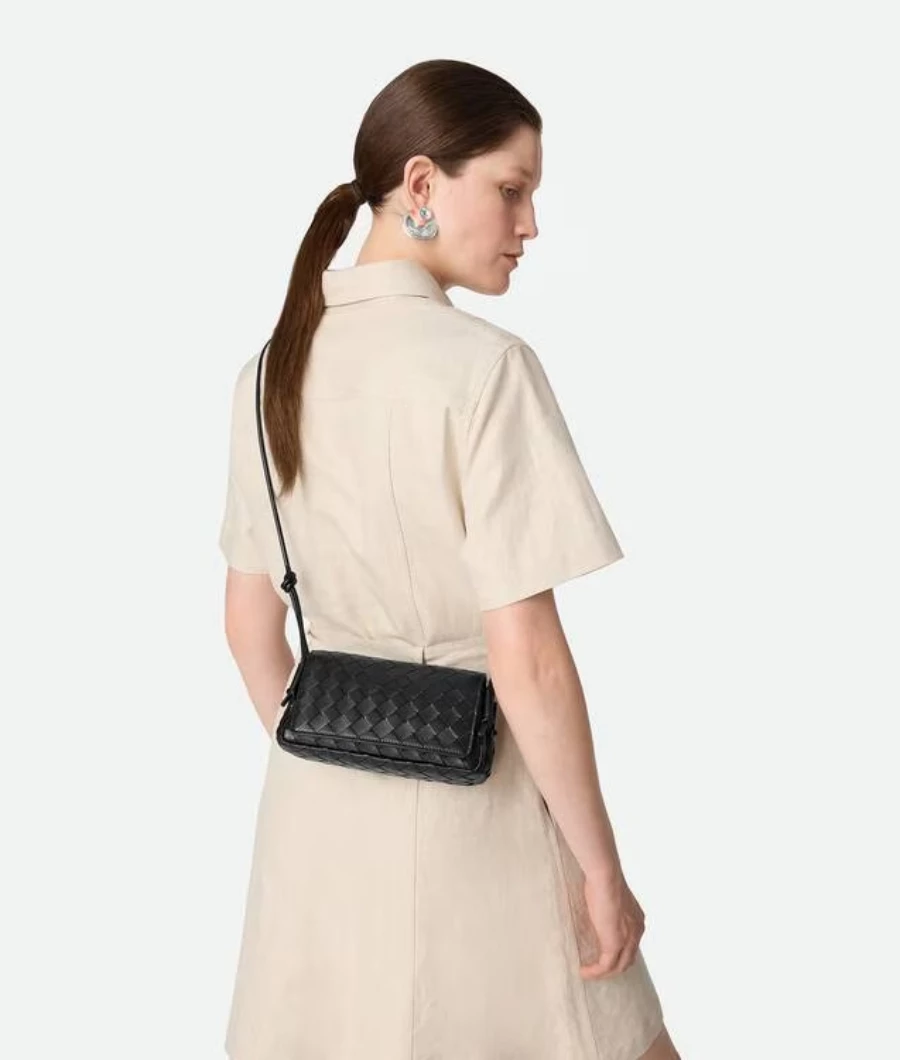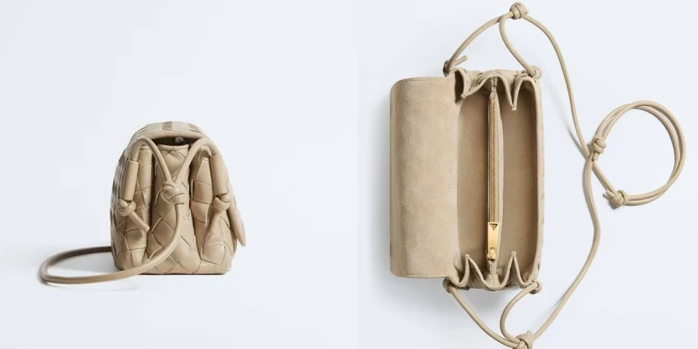 Bottega Veneta 最經典的元素即為 Intrecciato 編織皮革。這項工藝誕生於 1975 年,源於縫紉機難以處理厚實皮革,工匠因而改以手工將柔軟羊皮切條並交錯編織,意外使其成為品牌最具代表性的符號。而「Notturno」這款包正是以此技法製成,全包身皆採皮革編織,展現高度品牌識別。