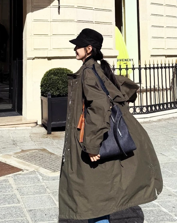 這套造型展現了章若楠截然不同的率性大氣姿態,散發出一種走在街頭、隨性卻充滿質感的時髦氣質。我特別喜歡她選用的這件軍綠色廓形的長風衣,大面積的低飽和色彩在歐式建築前顯得格外高級,也襯托出她那份生動且自信的氣場。同時,她也巧妙地搭配了黑色報童帽、大容量的深色皮質托特包(包包上頭還掛滿了滿滿吊飾),為整體的俐落風格加入了一絲甜美的俏皮感。正是這種拿捏得宜的酷甜平衡,格外迷人!來,我們也可以像章若楠依樣畫葫蘆一樣,颯爽的大衣或風衣套上,直接背個大包走人!