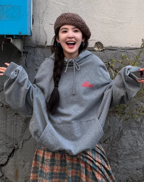 章若楠又再次以充滿層次感的美式復古混搭出。上半身穿著寬大的灰色連帽衛衣,寬鬆剪裁呈現出的慵懶感,與下半身紅綠格紋百褶裙營造出的文藝學生氣息形成完美對比。最關鍵的點睛之筆,莫於頭上那頂咖啡色針織貝雷帽,精緻的勾花編織與她側梳的魚骨辮相得益彰,不僅修飾臉型,更將休閒感瞬間提升至大人系可愛質感的街頭造型。