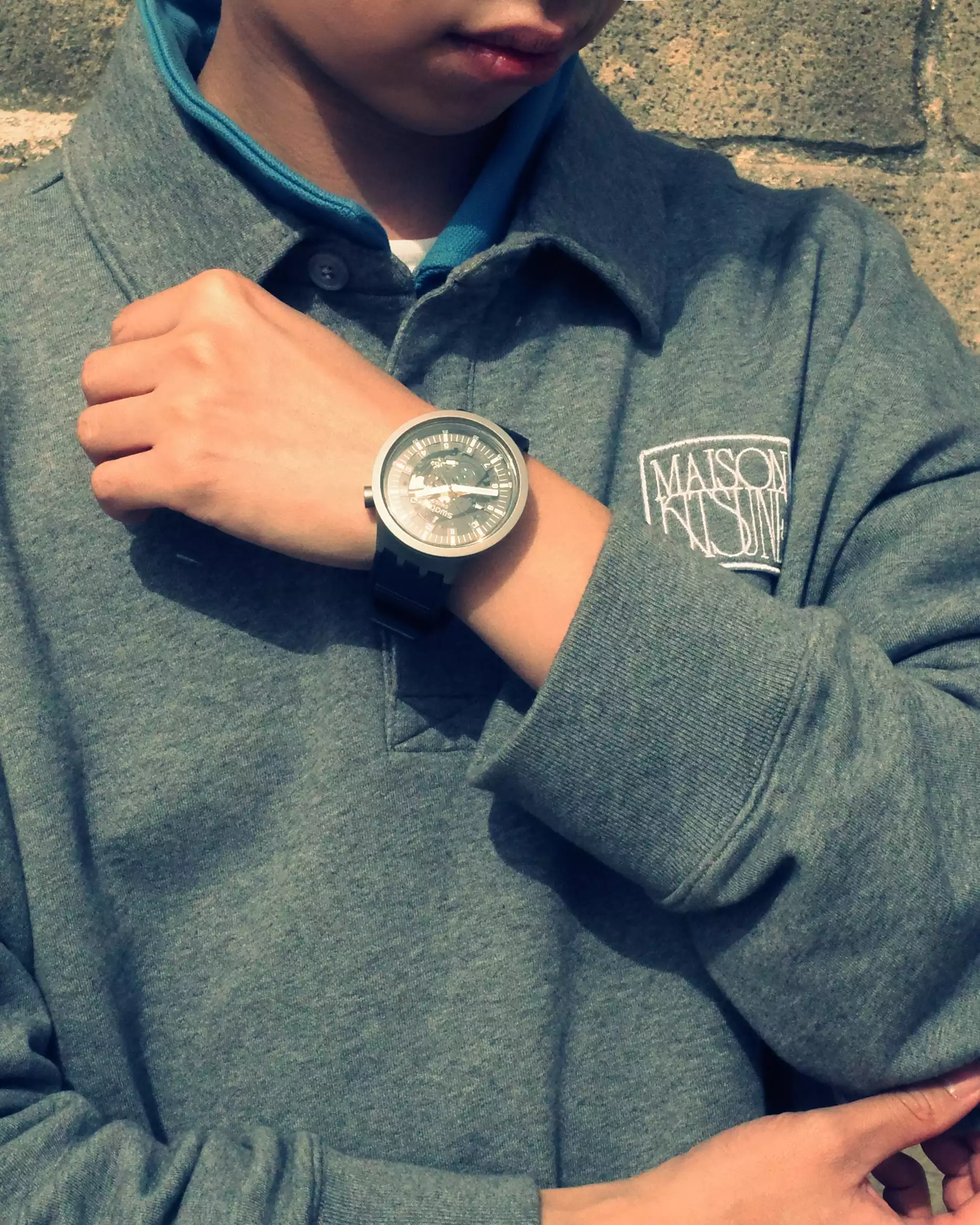 近年整體流行趨勢回歸傳統腕錶,不再只是讀時工具,而更像是一只風格名片,體現個人形象與品味。此次時尚編輯出戰時裝週,便以 Swatch BIG BOLD IRONY 系列靈活切換不同造型與場合。以經典黑色為基調,融合玩味與穩重的設計,在街頭與秀場之間都能自然駕馭,其最大亮點在於首次將 BIOCERAMIC 生物陶瓷基板與不鏽鋼錶殼結合,透過材質對比呈現鮮明層次;鏤空錶盤則增添立體效果,讓細節在光線下更顯突出,在俐落之中多了一份精工美學,也讓整體更具層次,同時,編輯也提出穿搭建議:「相較於一般金屬腕錶的正式感,這類設計反而更適合混搭,無論是搭配寬版西裝、工裝外套,甚至簡單的白 T 與牛仔褲,都能成為造型亮點。」