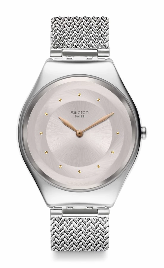為符合快速切換穿搭樣板的需求,另一款則推薦更為輕盈且具中性魅力的 SKINSAND,以簡約設計重新詮釋腕錶的性別界線。整體以銀色不鏽鋼打造,搭配細緻米蘭編織錶帶與極簡面盤,線條乾淨俐落,卻不顯銳利,反而在光澤之中流露出柔和質感,呈現出一種「柔中帶剛」的美感張力。相較於強調存在感的錶款,這類設計更適合用來調和造型,時尚編輯提點出無論是搭配全白或米色系套裝、絲質襯衫搭配寬褲,甚至是剪裁簡約的洋裝,都能自然融入,模糊正式與休閒、剛性與柔性的界線。對時尚編輯而言,SKINSAND不僅是應對多場景的安全選擇,更是一種不被風格框架限制的表現方式。
