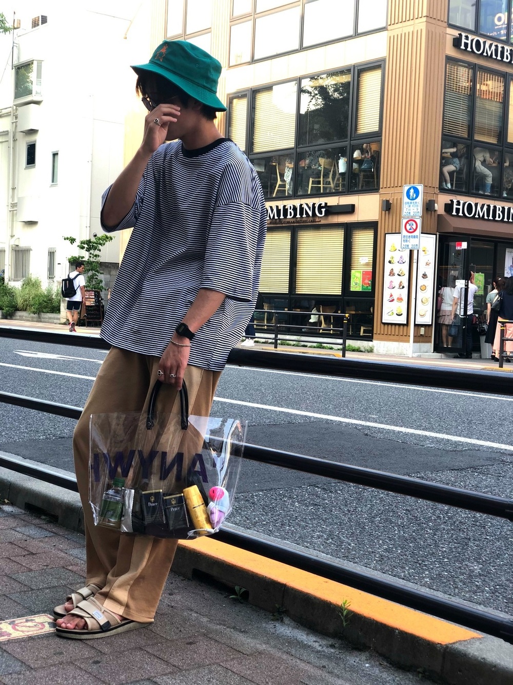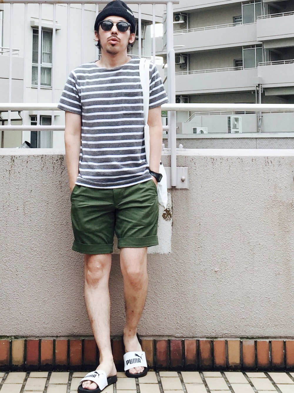 換上短褲與 Logo 拖鞋就能讓造型立即展現率性的夏日季節感,此時再利用條紋上衣將隨興的氛圍維持地恰到好處。想避免短褲與拖鞋的隨便印象,不妨搭配條紋上衣一同完成穿搭。