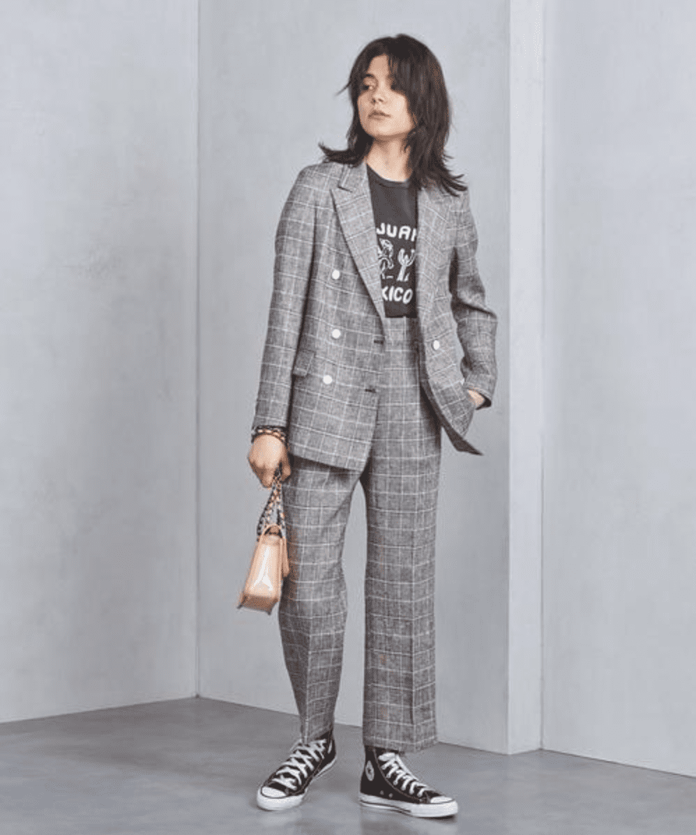 透過成套的西裝外套及長褲容易表達出濃厚的紳裝風格,而灰底格紋除了散發秋日季節感外也增添豐富的層次感。雙排扣西裝版型更是俐落都會感的代名詞,加上選擇帆布鞋取代皮鞋刻意凸顯日常感,是無法習慣立即開啟紳裝模式的女性讀者們可以首先嘗試的造型!