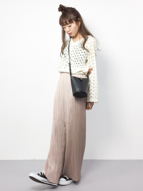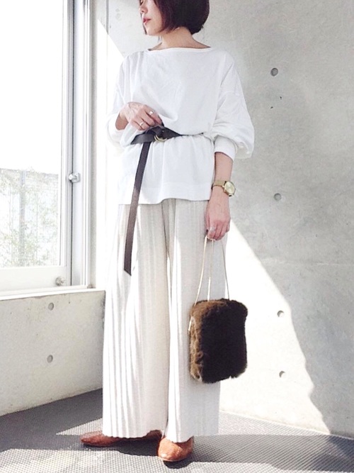 沒有穿搭靈感時,one-tone的方法就是搭配正解。而白色寬褲往往讓有下身身型困擾的人有所畏懼,只要選擇百褶款式,利用多重的摺線與寬鬆的褲管轉移注意力即能達到修飾效果。