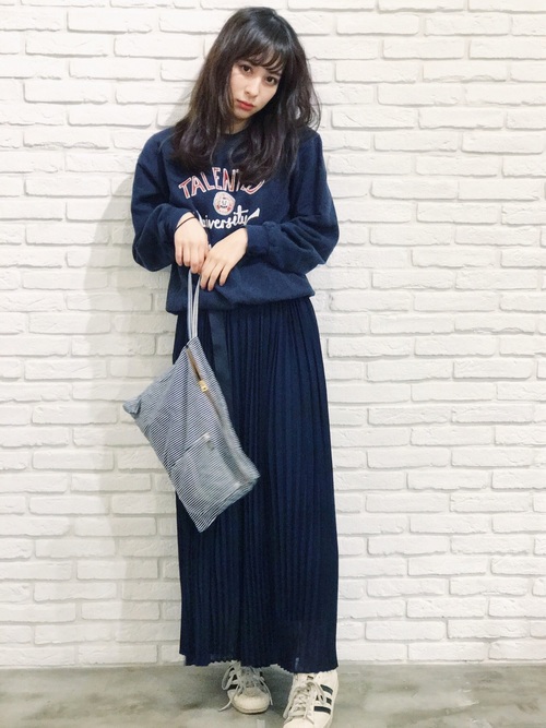 黑色百褶長褲的優雅印象混搭上輕鬆氛圍的大學Tee、球鞋以及帆布手拿包,兩種風格的單品交織出了可愛的女孩造型。
