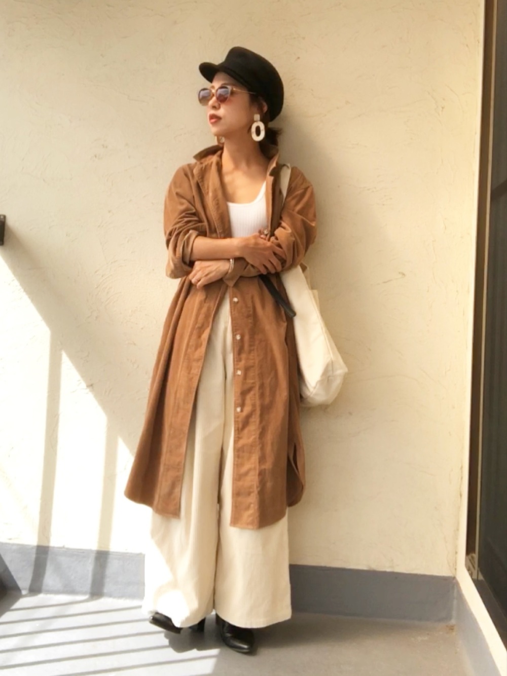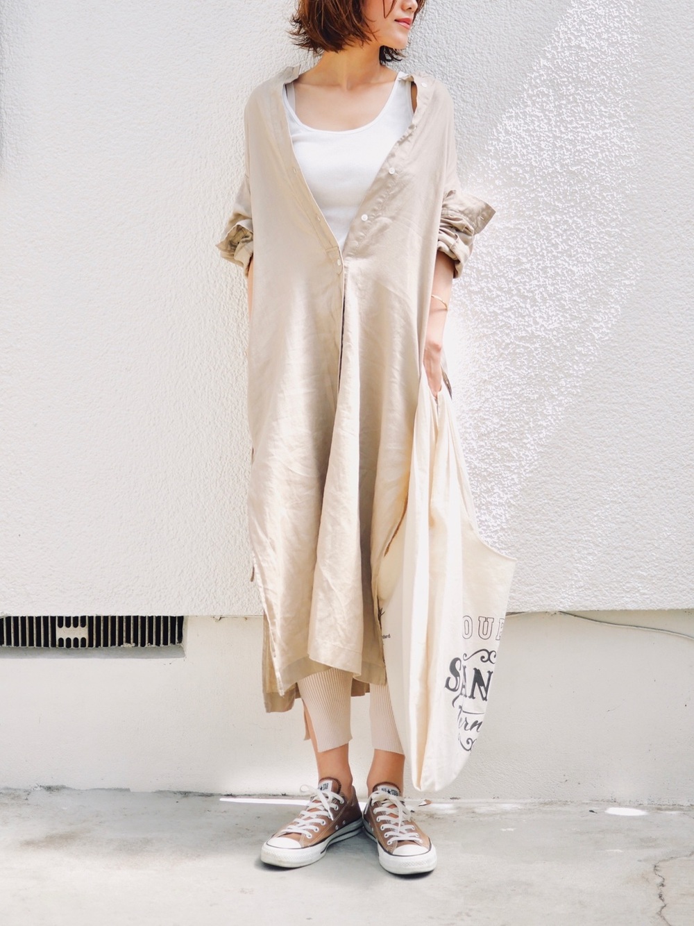 米白色的襯衫式洋裝看似個性平淡,但若是和同色系的配件相搭倒能展現對於穿搭用色的敏銳度。卡其色帆布鞋是今年秋季的人氣配件,一致的色彩感讓換季的心情淺來更加輕鬆。