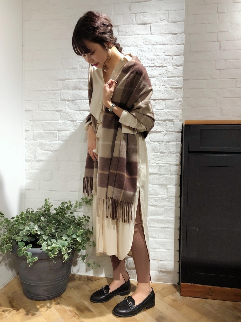 以棕色系的格紋圍巾作為披肩隨興地披掛於肩上,為一身優雅的連身造型帶來畫龍點睛的層次效果。鞋履配上帶有雅痞感的樂福鞋,與全身懶懶的氛圍相互呼應。