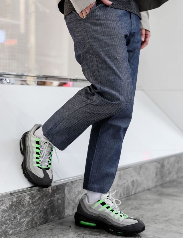 經典的人字紋丹寧褲上不但讓休閒感的丹寧轉換成沉穩的氣質印象,也創造不同於一般丹寧風格的復古感,加上輕水洗處理讓舒適度更加卓越,而九分褲的設計版型只要穿上高於腳踝的長襪,走動時能不經意露出襪子的讓足部的整體性更加搶眼,在秋冬滿街大衣與厚實毛料衣褲的季節中依舊是場上的時髦焦點。