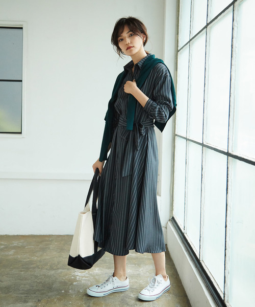 當造型靈感缺乏時,長版襯衫洋裝能迅速解決外出的穿搭煩惱。利用條紋增強長版衣著架式感,並在肩上披上一件針織毛衣營造層次,還能混搭球鞋輕鬆踏出休閒又不失女人味的氣質。