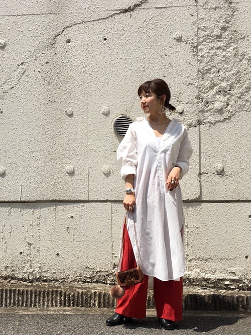 平時不太敢穿上顏色鮮豔的褲款時,用來搭配在長版襯衫內是一個較為內斂的時髦選擇。白色開領長版襯衫展現十足休閒感,再搭配上一件色彩飽和搶眼的紅色寬褲,簡約又不失目光的穿搭就能輕鬆完成。