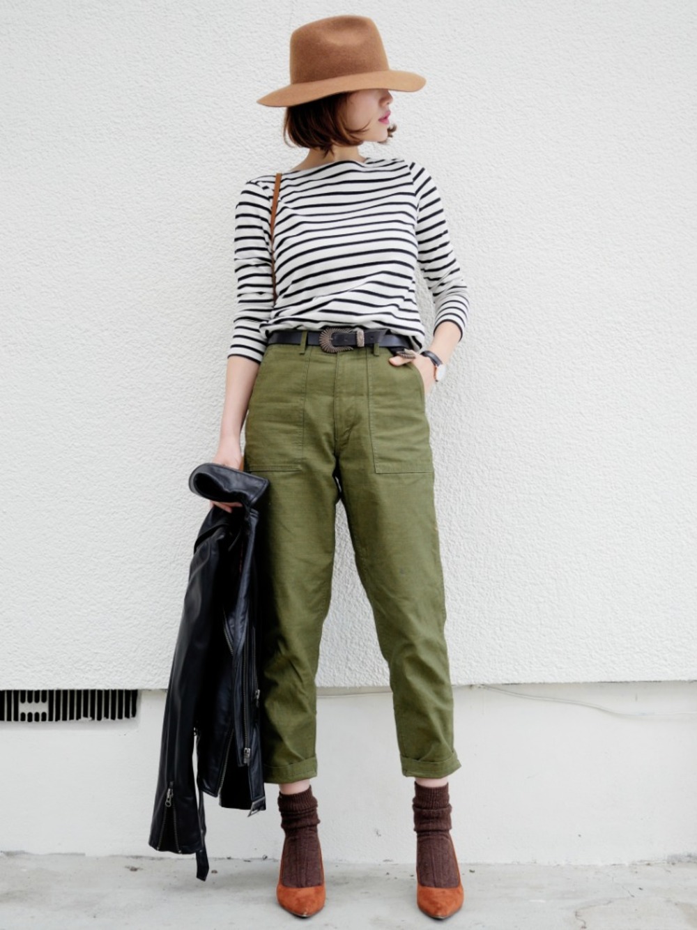 軍綠色搭配大地色系到了秋冬依舊是不敗的組合,與黑白條紋上衣搭配讓基本款的單品也能穿出新意。利用長襪和高跟鞋配上中性的工裝褲,就算是不擅女孩感穿搭你也可輕鬆駕馭。