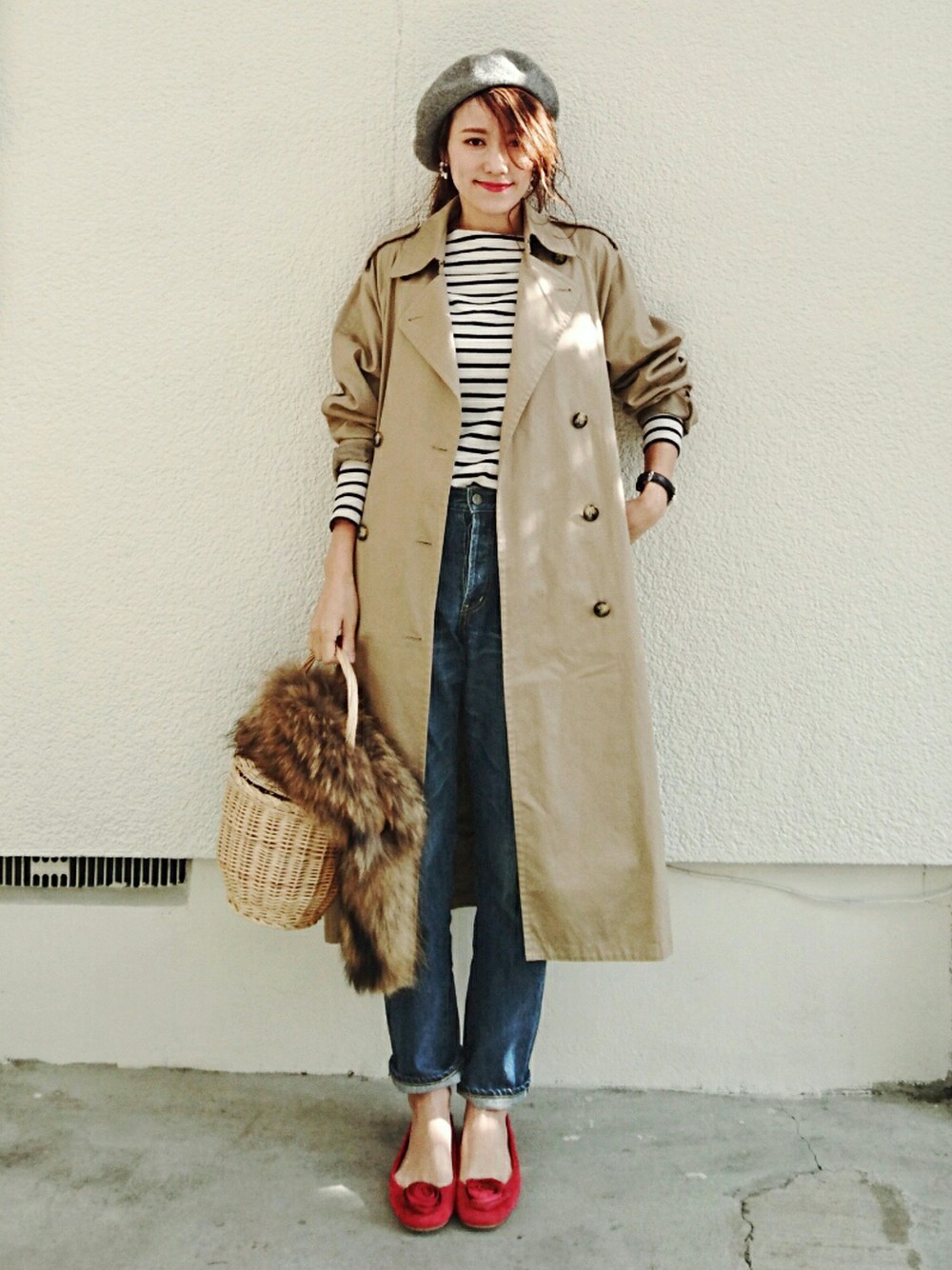 苦於思考條紋上衣還能有什麼變化感的話,就參考這套穿搭吧。利用紅鞋將輕鬆的休閒色調點出重點,再將袖口隨性地捲起,並拉出內搭衣袖,呈現簡單而美好的層次感。