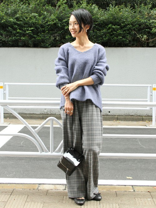 藍色系的莫蘭迪色相當優雅,搭配上氣質的落地格紋寬褲不僅展現了恰到好處的大人感,還讓人留下時髦的穿搭印象。