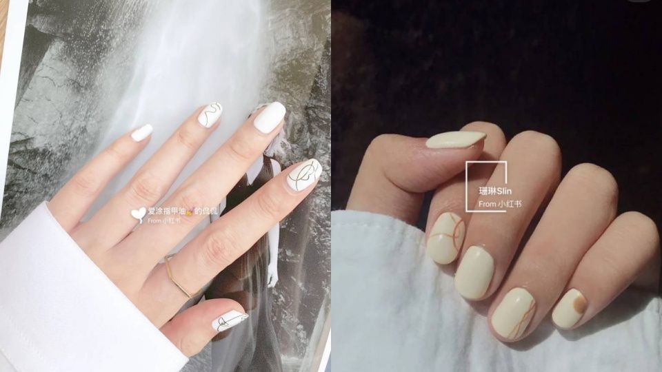 第一款就是最近在韓國也很夯的線條款白色美甲!除了搭上最近很熱門的性冷淡風熱潮,線條也能讓手指頭看起來更修長~而且圖案不會過於花俏,卻很有設計感!如果底色想要做純白色的女孩,建議線條顏色可以選擇金色,讓甲面上的線條成為手指亮點,看起來比較不顯黑!