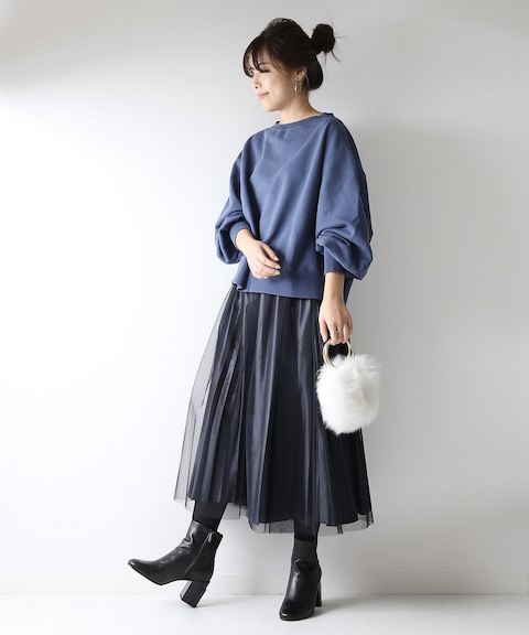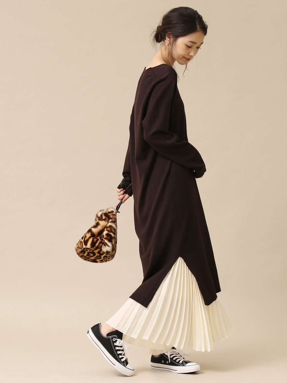 純粹造型的基礎百褶長裙,以雪紡的面料增加浪漫柔美的感受。選擇寬身的長版針織上衣與之搭配,詮釋出一股慵懶的隨性美感。混搭一只豹紋小包再踏上休閒感的帆布鞋,立即營造出率性的日系印象。