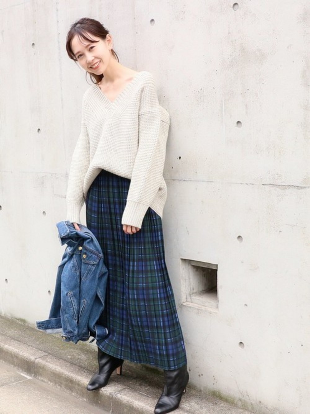 融入時髦元素的格紋百褶裙,利用藍格紋配色流露出輕復古的風格韻味。搭配坑條織紋的毛衣,V 領剪裁不僅能製造小臉線條,運用上衣內紮的小技巧還能帶來顯瘦挑高的身形比例,加上高跟靴還能使修飾度更加理想。