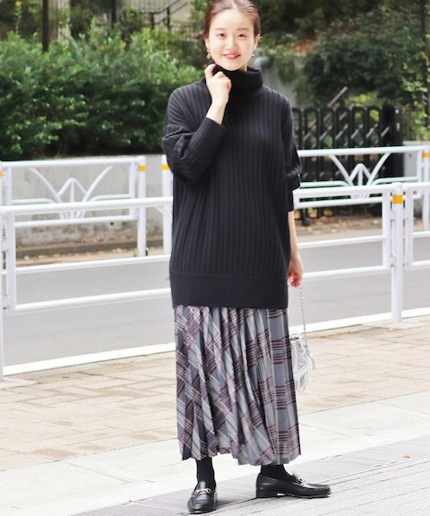 如果你喜歡低調的造型,又想為穿搭增添令人驚艷的小驚喜時,可以將整體的層次拉低。先以高領毛衣拉長上身線條,再利用下擺格紋百褶的飄逸感創造優雅氣息。不過分搶眼的時髦感,讓人留下洗鍊的好感印象。