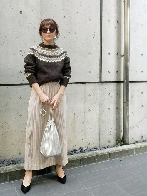 想將自然感的圖騰毛衣成功穿搭出優雅氣息的話,就選擇一件窄版長裙作為下身的搭配單品吧。對比的色調不會使深色的毛衣也能展現活潑感,而上寬下窄的身形線條也提升了大人感的指數。