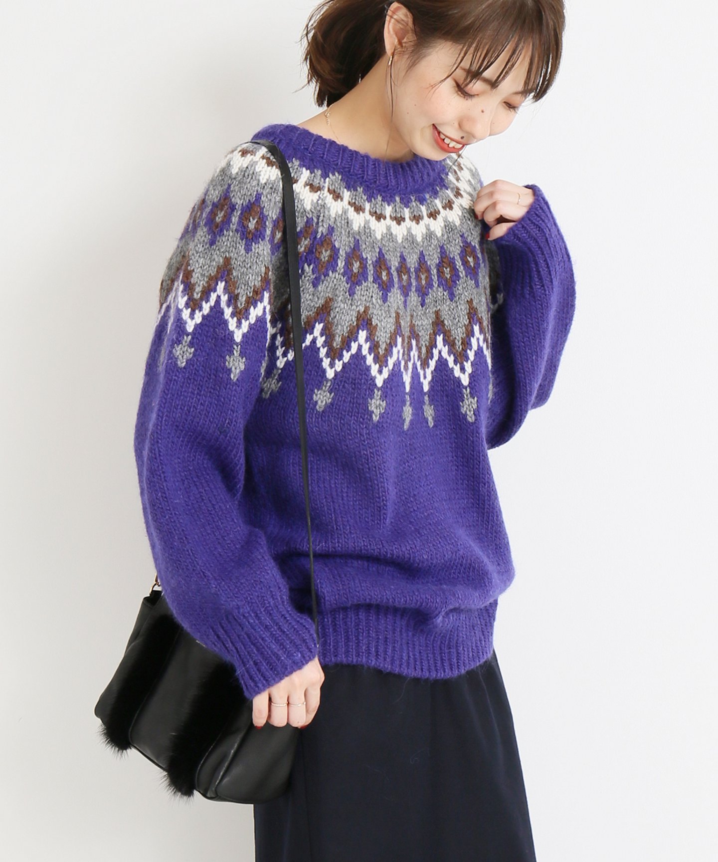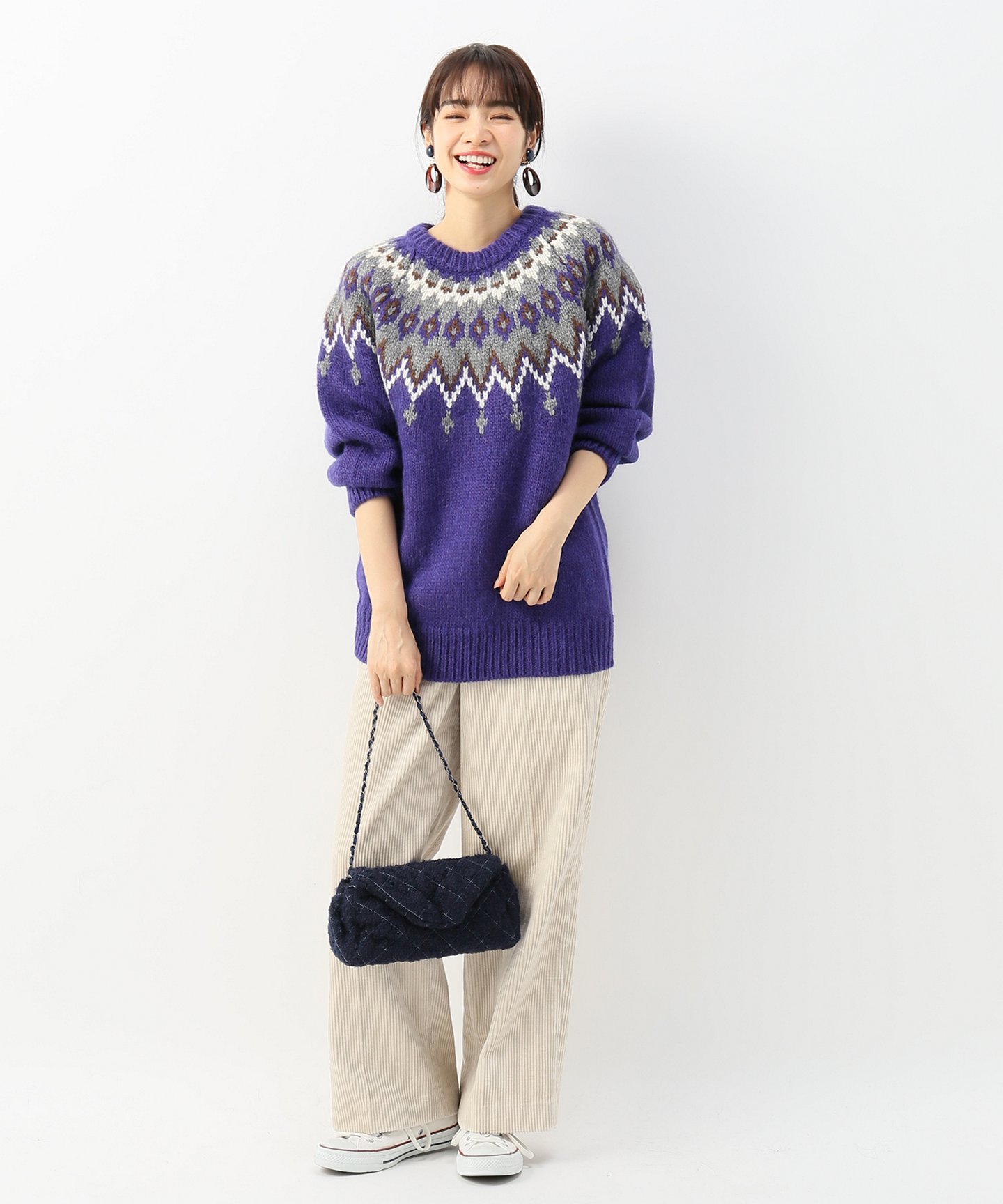 比起一整件佔滿圖騰的款式,從領口處開始稍微向下延伸至中央的幾何圖案款更為經典且好搭配。不經意地就能抓住他人目光的北歐風毛衣,只需選擇一件簡單素色的下身單品即可輕鬆完成出色的季節造型。