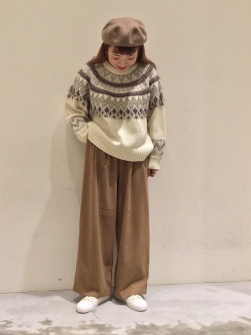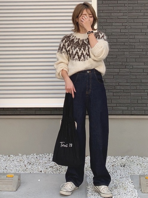 將北歐風的圖騰毛衣紮入褲頭內,徹底地將圖騰織紋作為穿搭的主視覺。利用高腰的長褲修飾出腰身,即使上身毛衣較為寬鬆也可以避免整體的臃腫感覺。