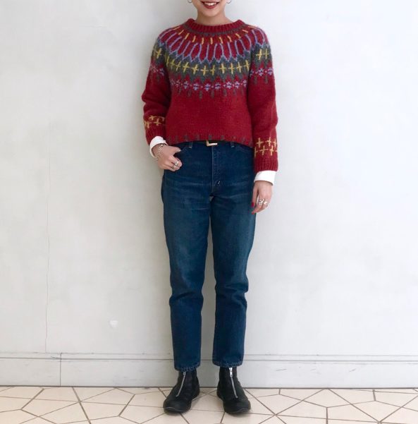 比起純色的紅色毛衣,搭配上了北歐風圖騰的款式反而更容易穿搭。以尺寸適中的毛衣與修身的牛仔長褲組合出俐落的中性氣質,用零距離感的外型展現冬日好感衣著。