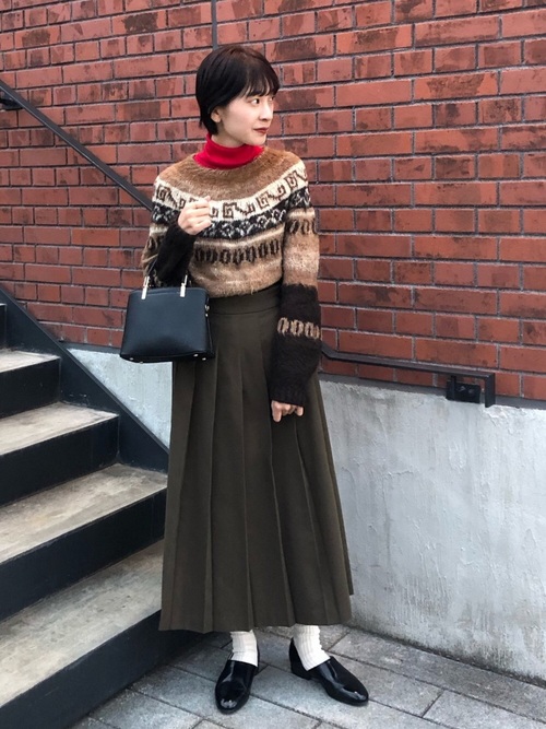比起女人味更喜歡可愛氣質的話,圖騰毛衣就以寬百褶長裙穿搭出俏麗印象吧。原先靠著圖騰就相當具層次效果的上身,再刻意多穿上一件高領內搭還能有效增強個性感。下身則以白襪銜接長裙與皮鞋,表現出輕復古的時尚風格。